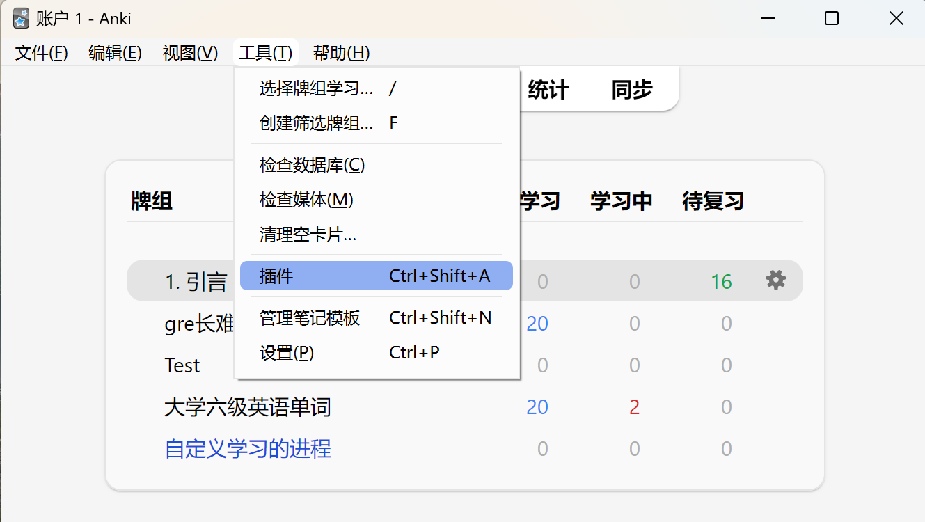 1.打开Anki并登录账号 >> 选择上方 工具 >> 插件 >> 获取插件