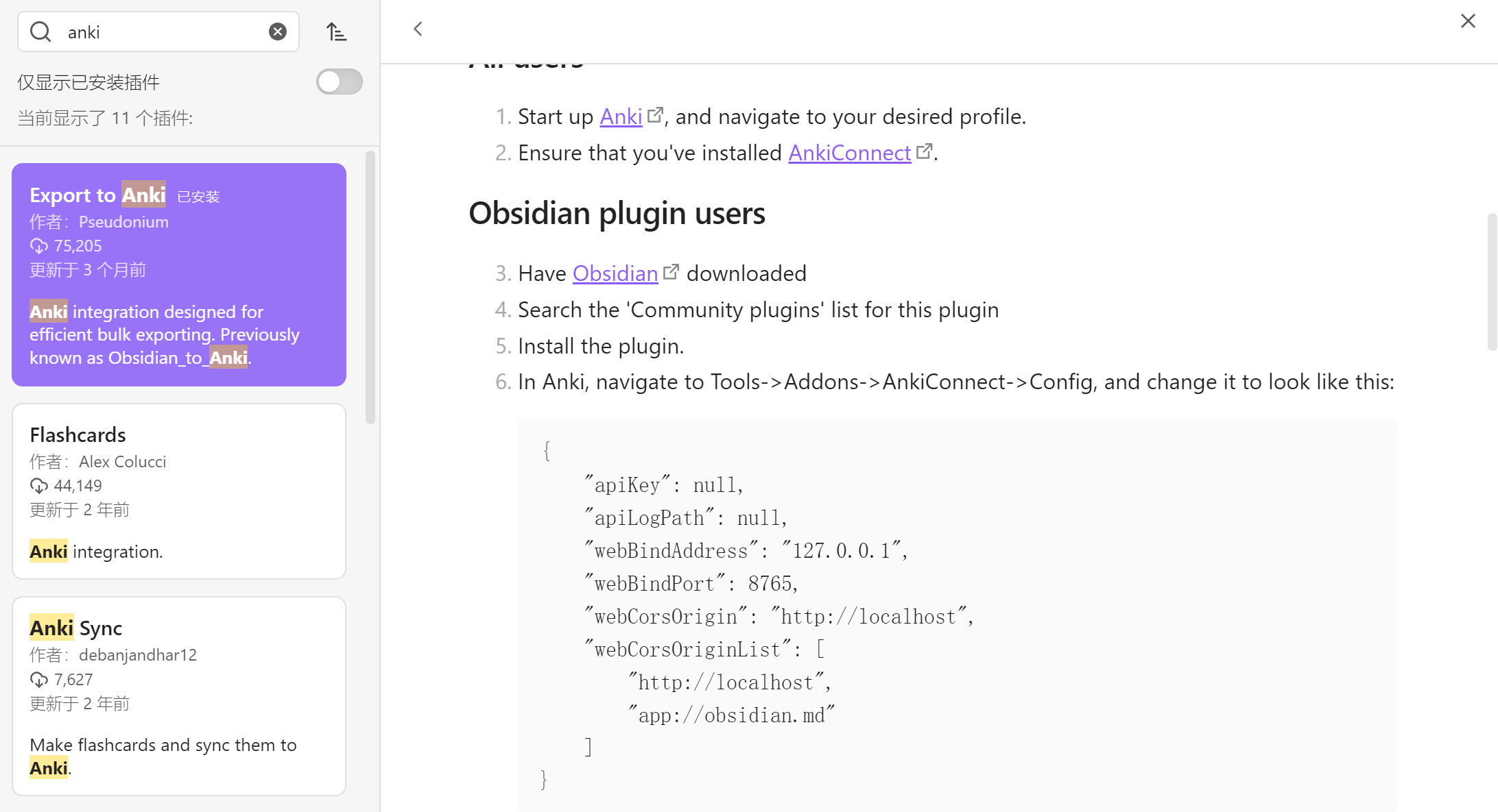 2.在插件浏览页面下滑找到 Obsidian plugin users 复制下方的代码并保存,后面配置Anki时会用到