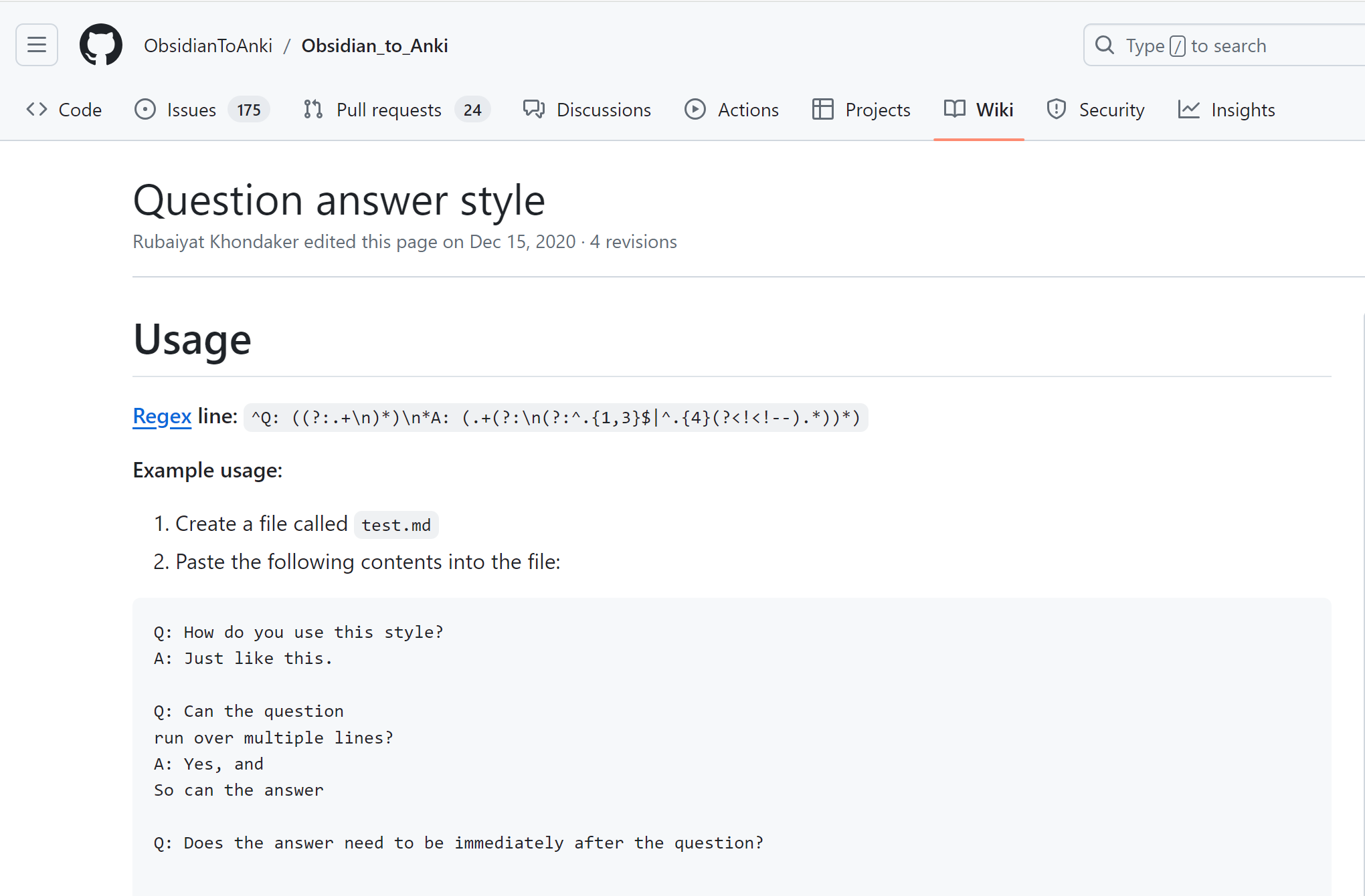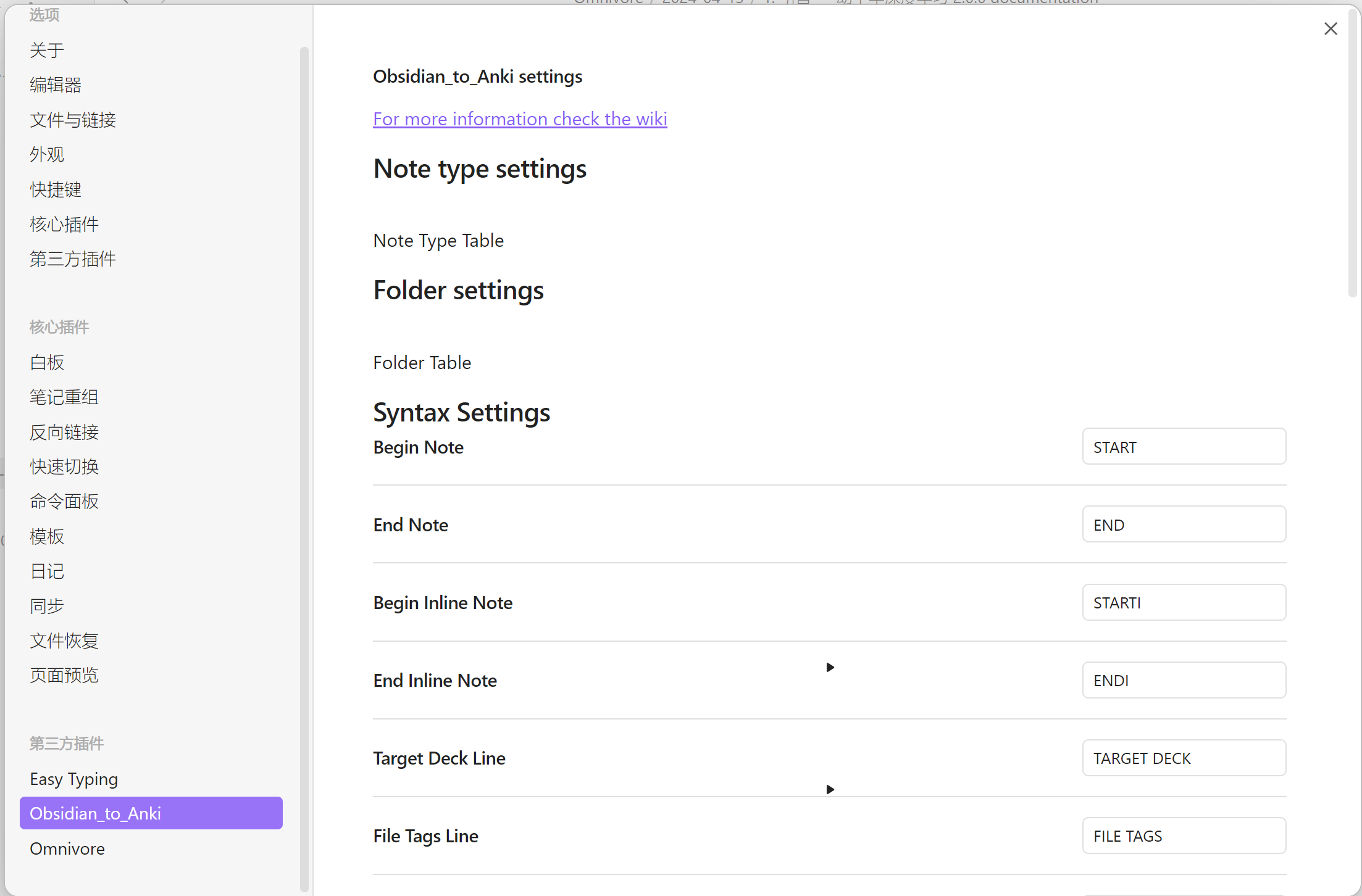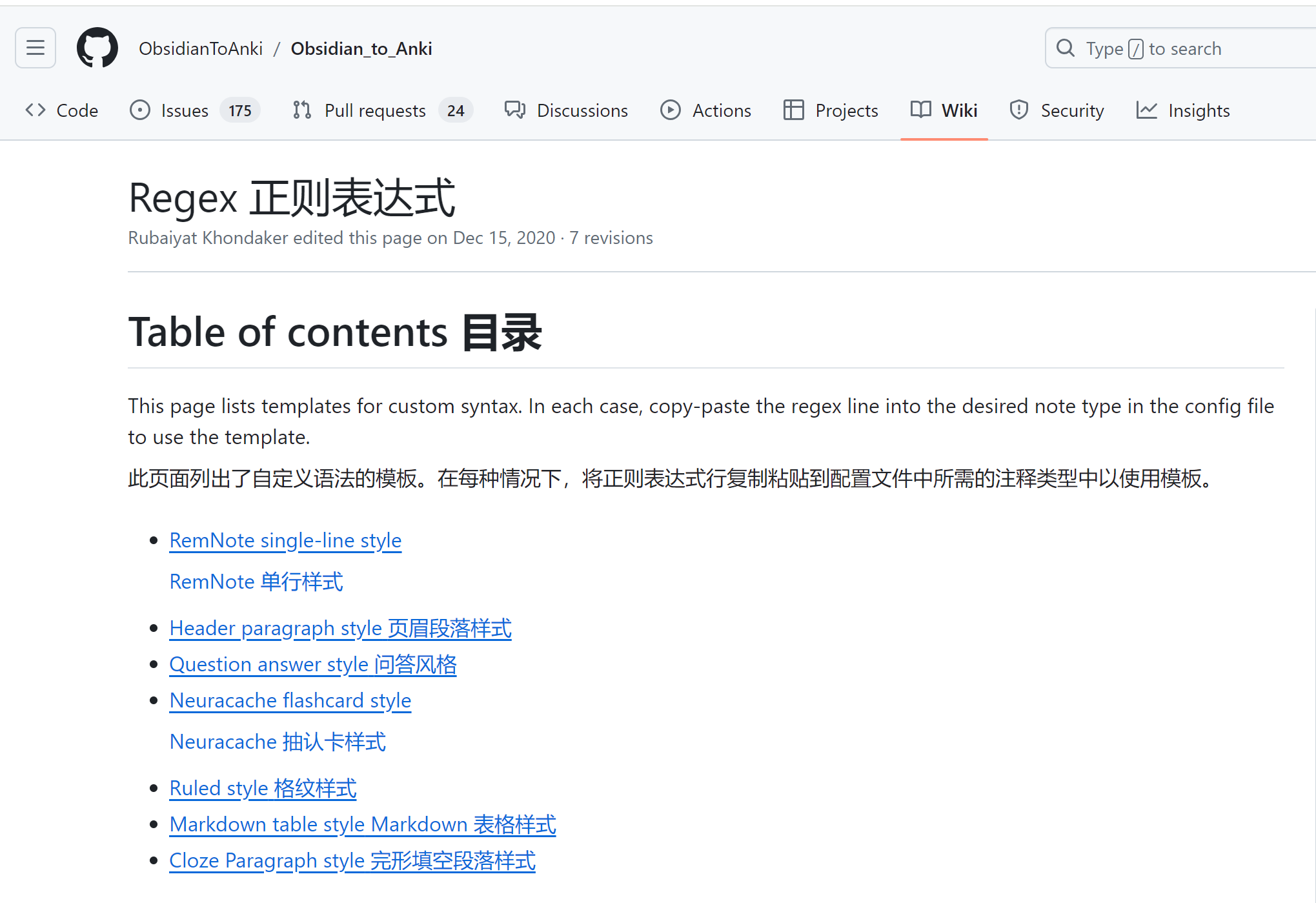 3.前往插件的GitHub主页,使用下方提供了正则表达式页面的链接Obsidian_to_Anki/wiki/Regex,在Regex页面可以获取不同形式的正则表达式