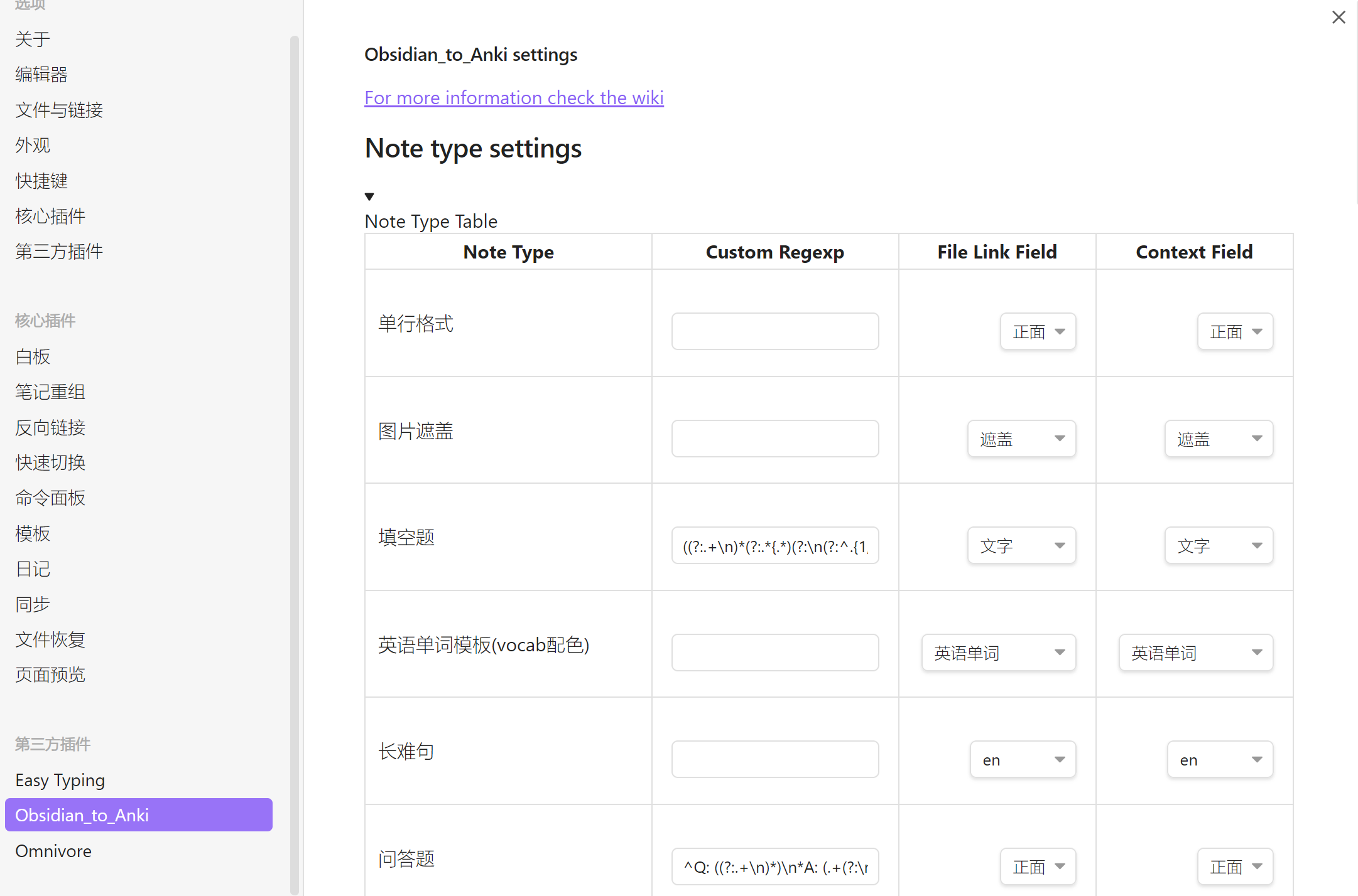 返回Obsidian插件并进入 Note Type Table ,在 Custom Regexp 中的问答题栏处粘贴复制的表达式即可