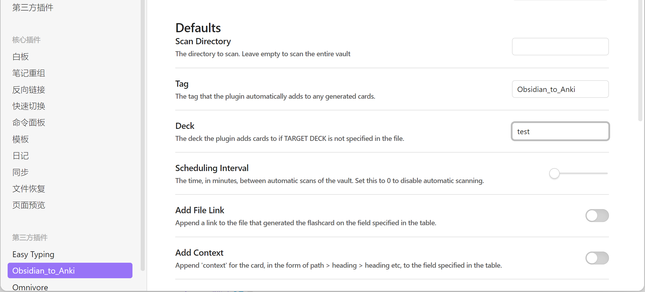 2.在插件 Default 处可进行一些基础设计, Deck 可以更改卡片在Anki中的生成位置,注意无需在Anki中先创建文件名