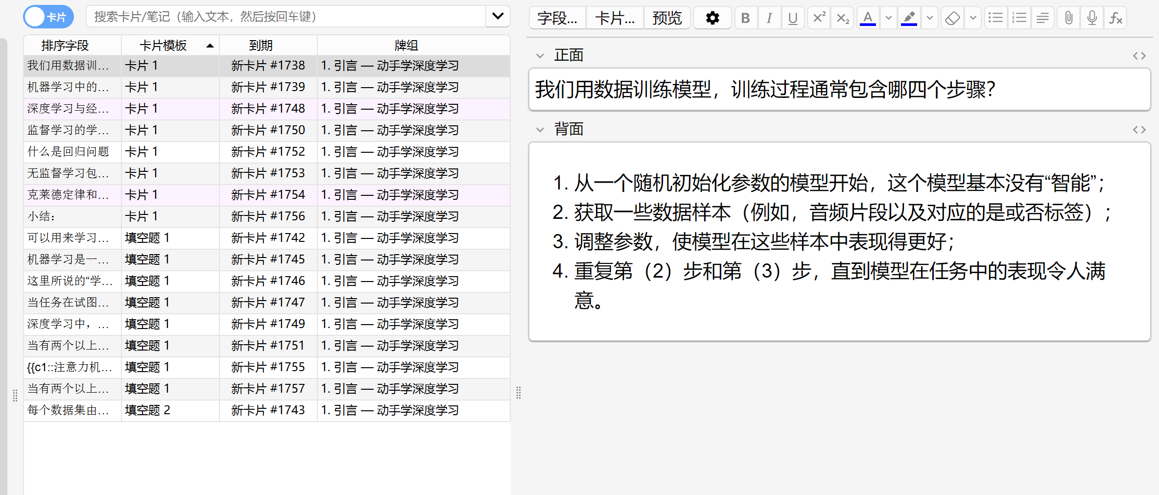 制作好后记得点击左侧最下方的卡片进行生成,注意,生成时需打开Anki 在Anki中查看效果:
