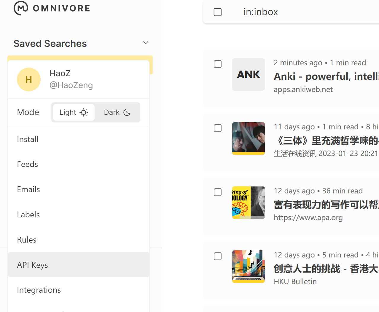 2.进入浏览器打开Omnivore >> 点击左下角账号 >> API Keys >> 复制当前浏览器的Key