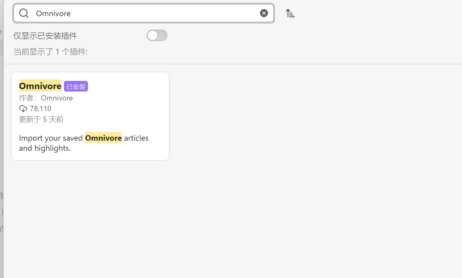 1.进入Obsidian后点击左侧边栏最下方的齿轮进入设置页面 >> 第三方插件 >> 社区插件市场 >> 搜索 Omnivore >> 安装