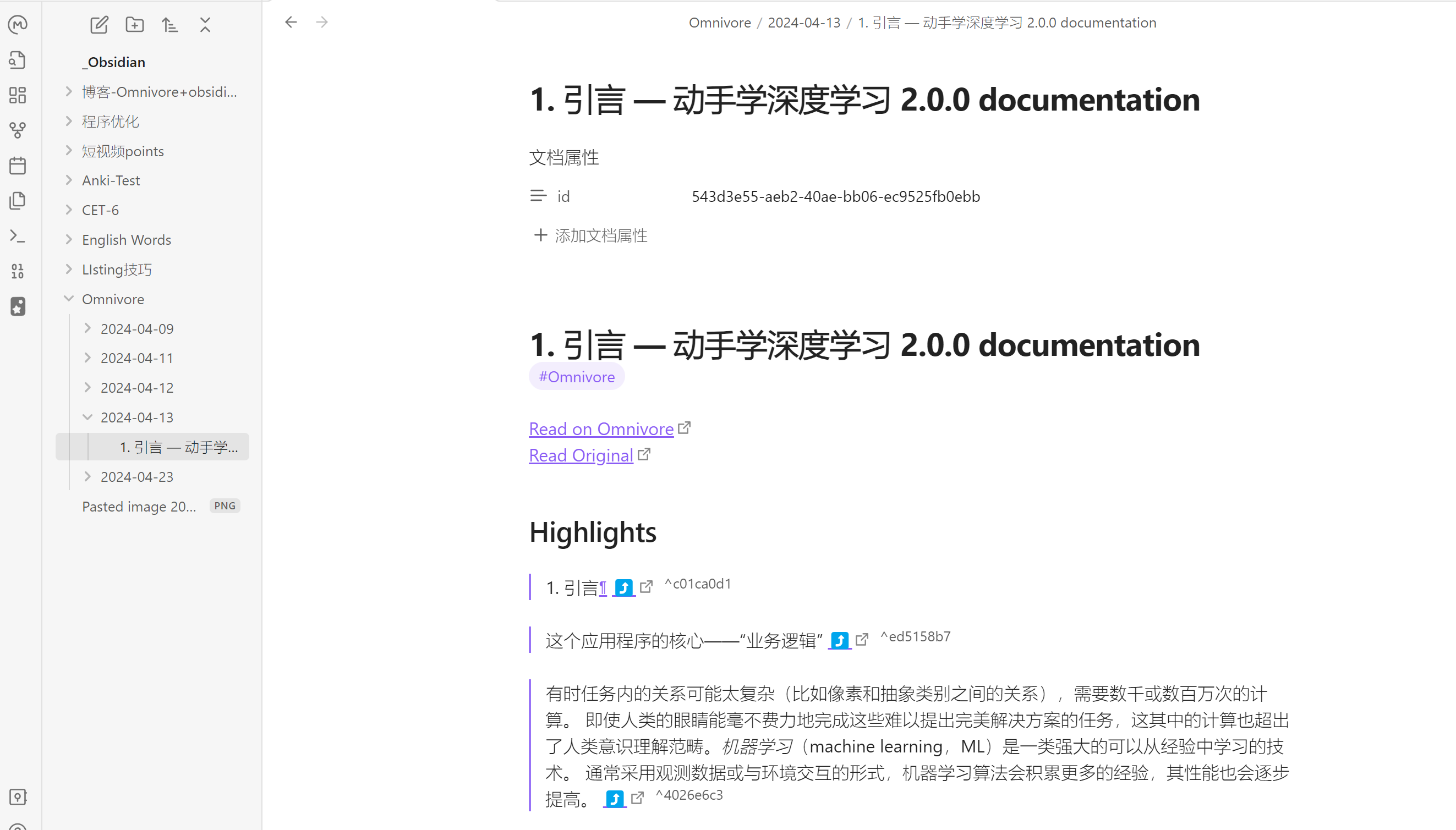 3.在inbox找到对应文章,在阅读时对重要内容进行高亮标记和注释,插件会自动将文章中高亮和注释内容同步到Obsidian中